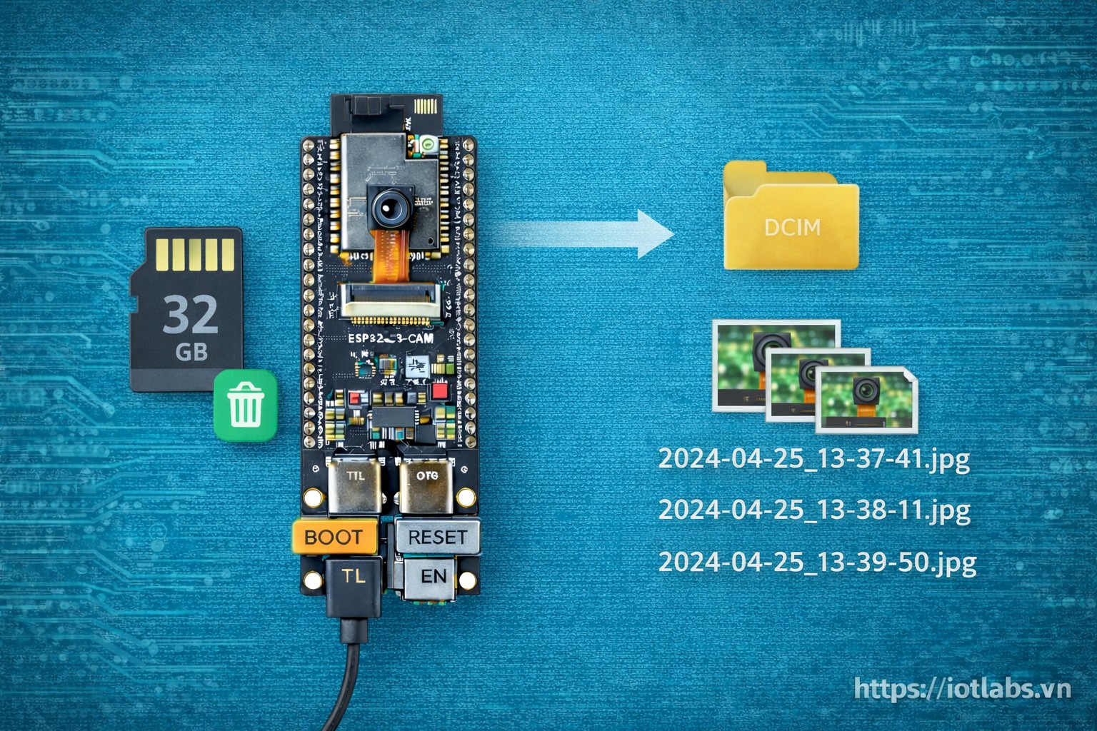 Lưu ý: Nếu bạn stream camera và đồng thời ghi thẻ liên tục, hệ thống dễ bị thiếu heap/PSRAM hoặc sụt áp. Bài này tập trung vào chụp ảnh và lưu thẻ (snapshot workflow).