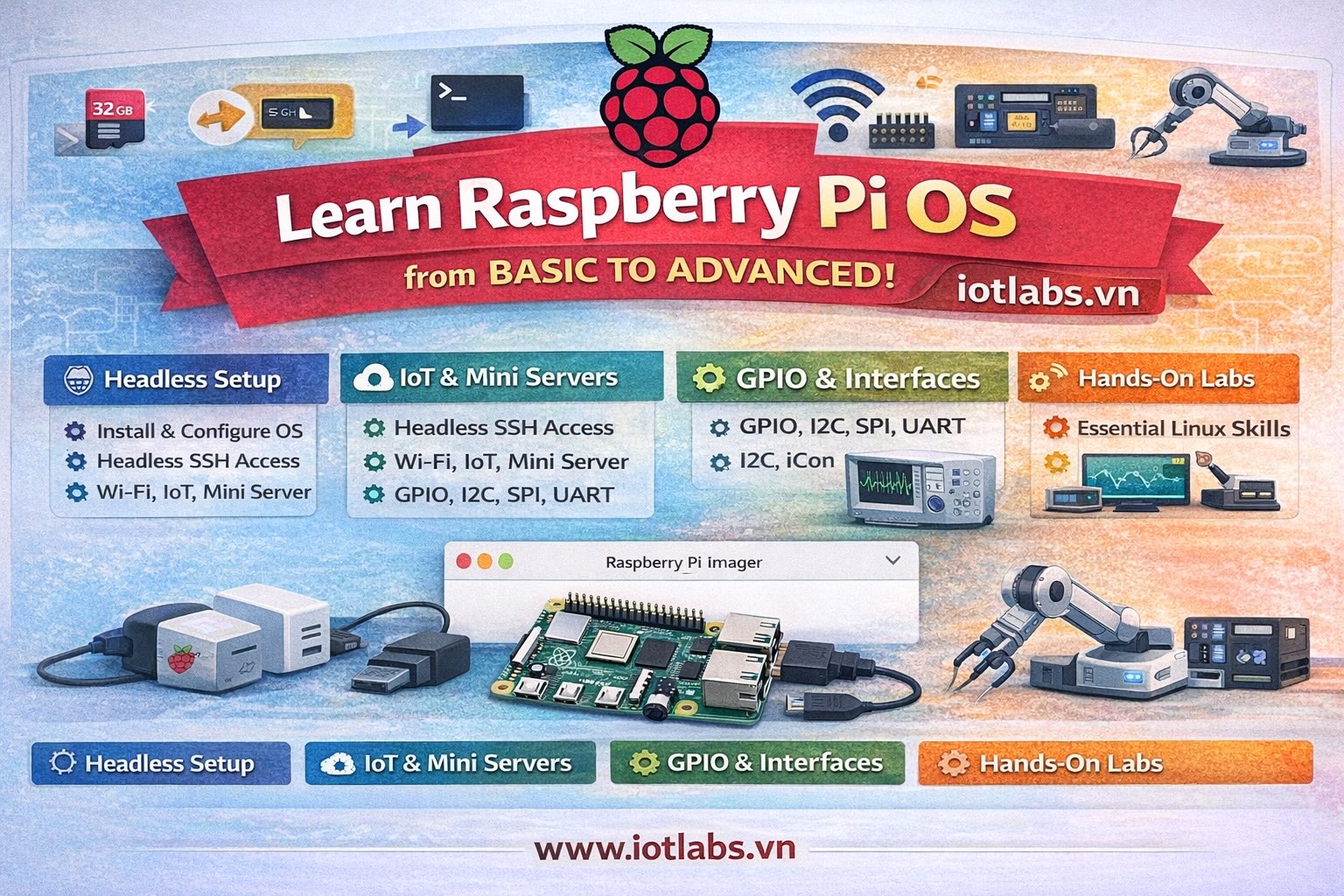 Nếu bạn đang muốn bắt đầu với Raspberry Pi một cách bài bản, đây sẽ là bộ bài phù hợp để đi từ số 0 đến mức có thể tự cài, tự cấu hình và tự triển khai những việc cơ bản mà không bị ngợp.