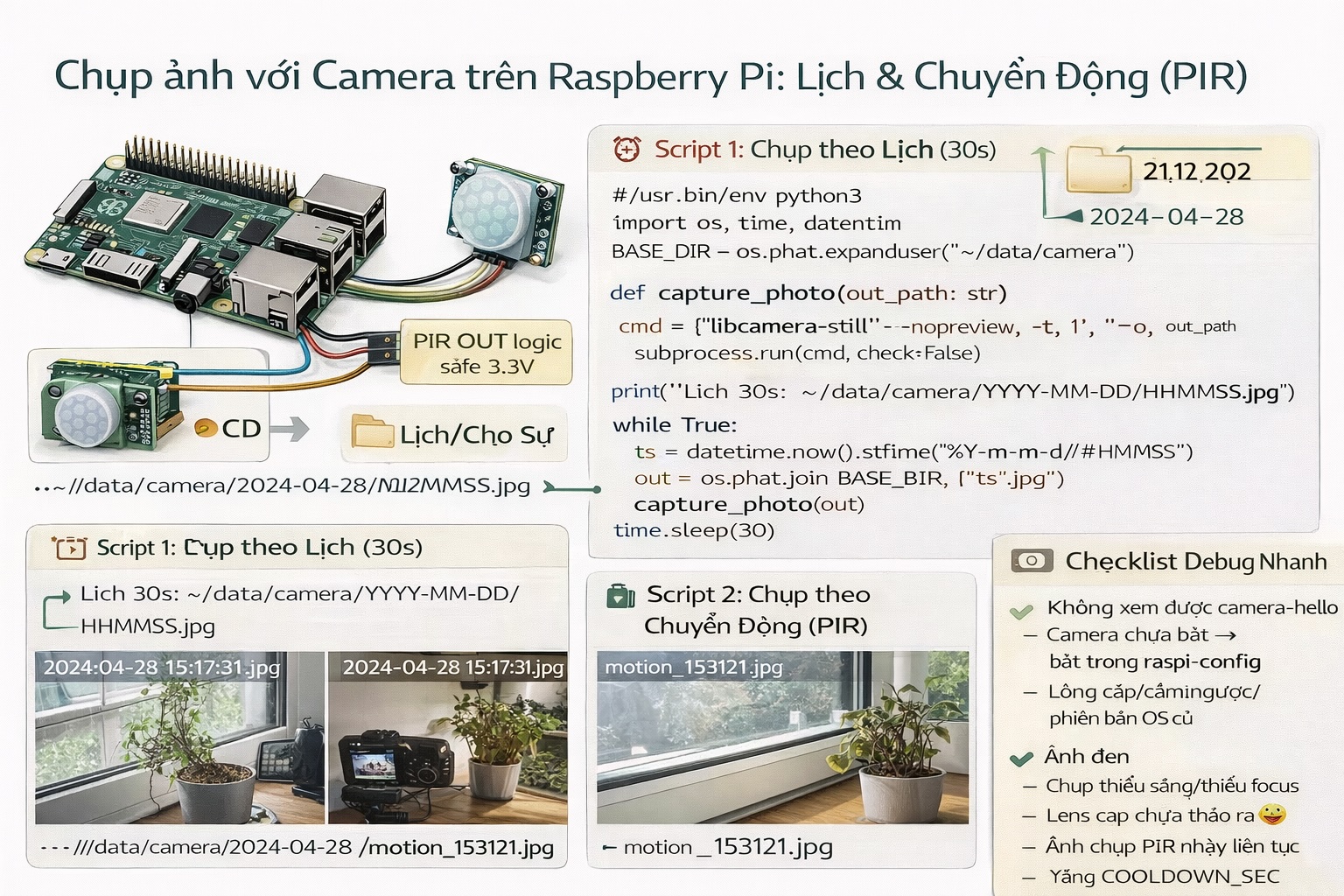 Series: Lập trình Raspberry Pi & Ứng dụng thực tế Phần 2 — Lập trình GPIO & phần cứng Bài 11: Camera cơ bản — chụp ảnh theo lịch / theo sự kiện (PIR) + lưu thư mục