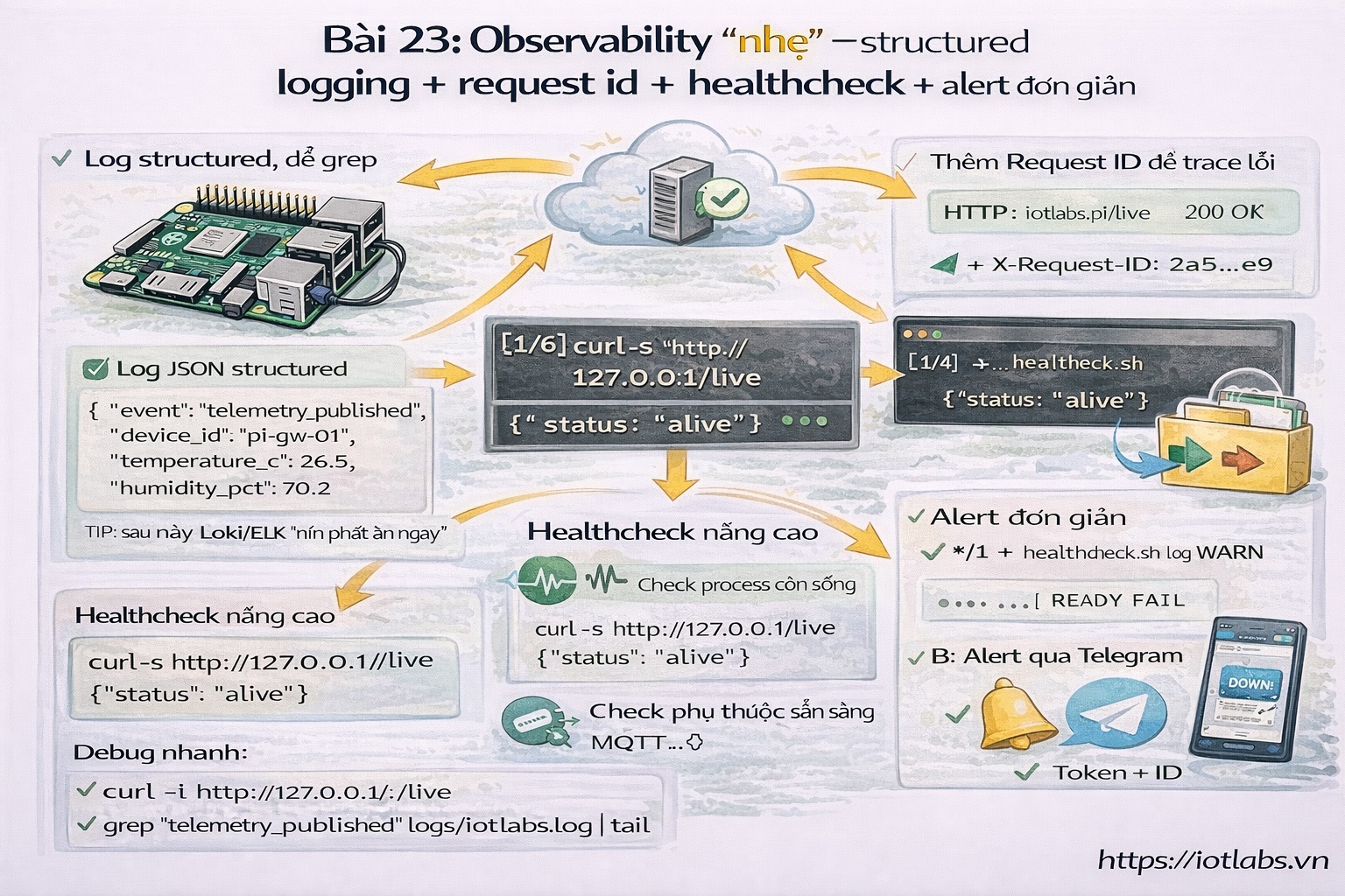 Series: Lập trình Raspberry Pi & Ứng dụng thực tế Phần 3 — Python “build app thật” Bài 23: Observability “nhẹ” — structured logging + request id + healthcheck nâng cao + alert đơn giản