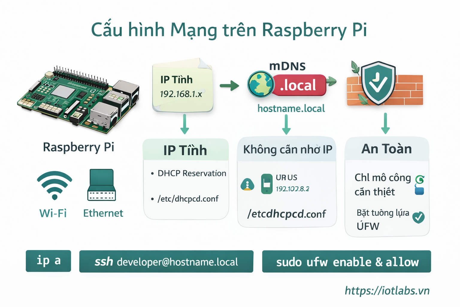 Series: Lập trình Raspberry Pi & Ứng dụng thực tế Phần 1 — Nền tảng Raspberry Pi Bài 4: Networking cơ bản trên Raspberry Pi (Wi-Fi/Ethernet, IP tĩnh, mDNS, port & firewall)