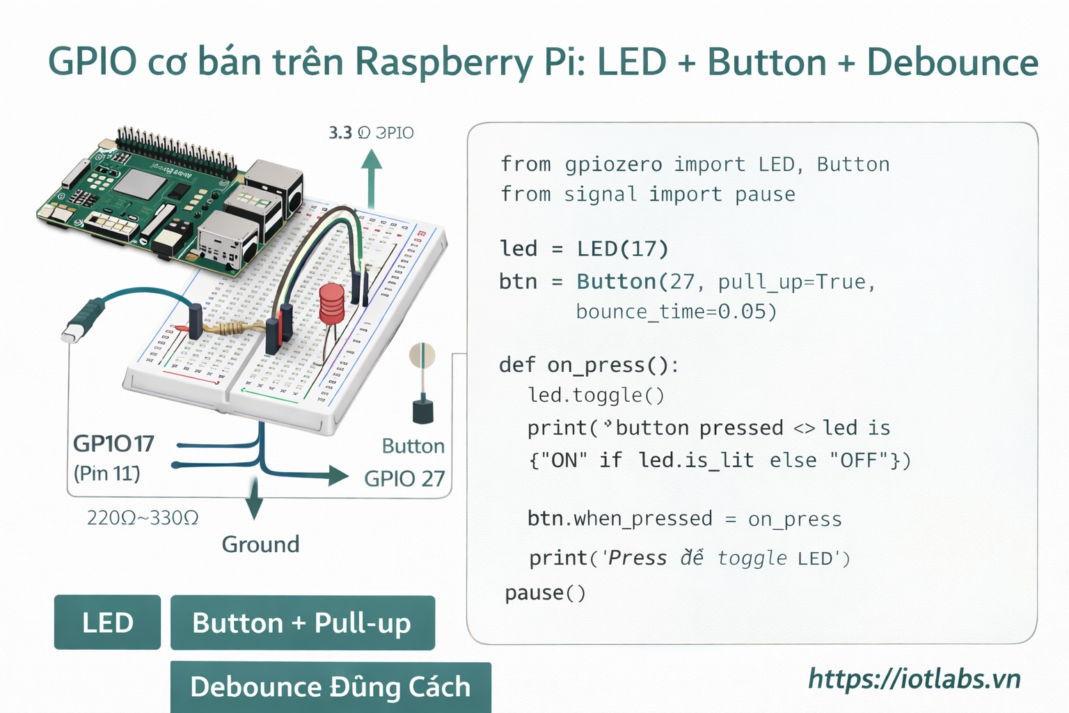 Series: Lập trình Raspberry Pi & Ứng dụng thực tế Phần 2 — Lập trình GPIO & phần cứng Bài 6: GPIO cơ bản — LED + Button + Debounce (làm “đúng chuẩn” từ đầu)