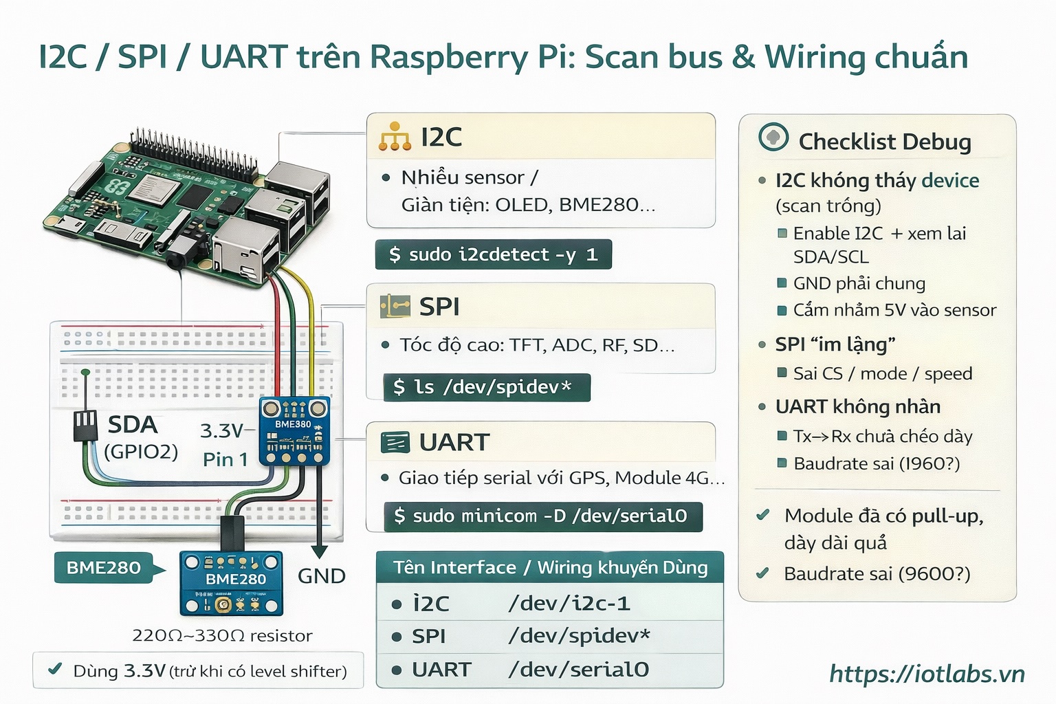 Series: Lập trình Raspberry Pi & Ứng dụng thực tế Phần 2 — Lập trình GPIO & phần cứng Bài 7: I2C / SPI / UART — Scan bus, wiring chuẩn, và lỗi thường gặp