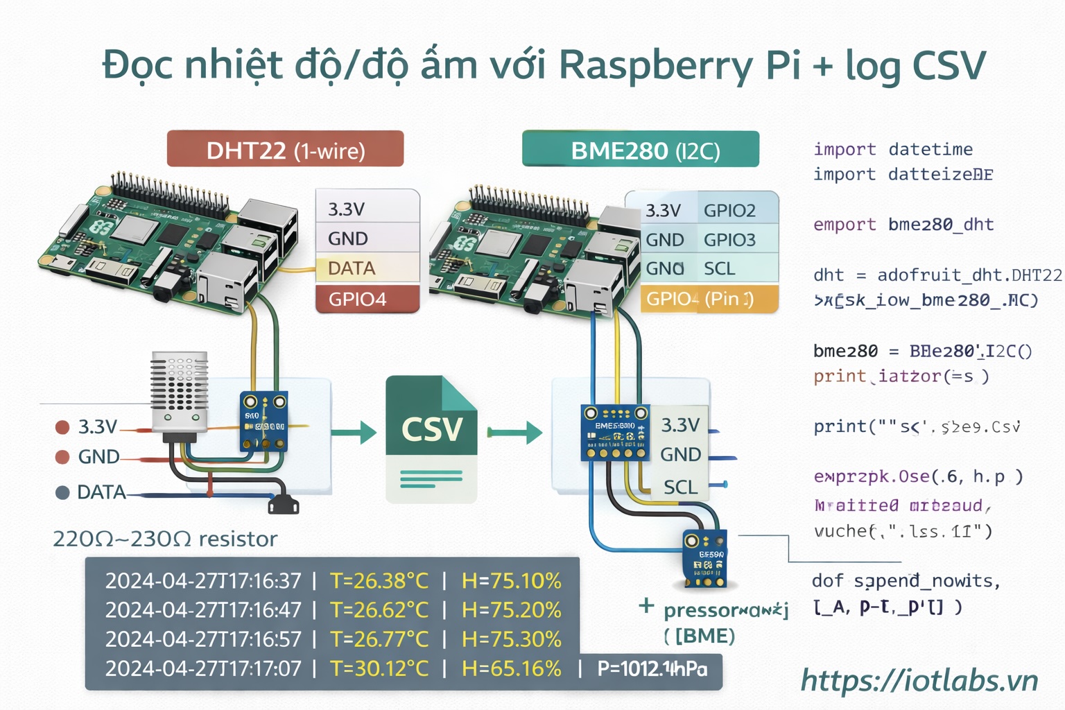 - Đọc sensor DHT22 hoặc BME280 trên Raspberry Pi.