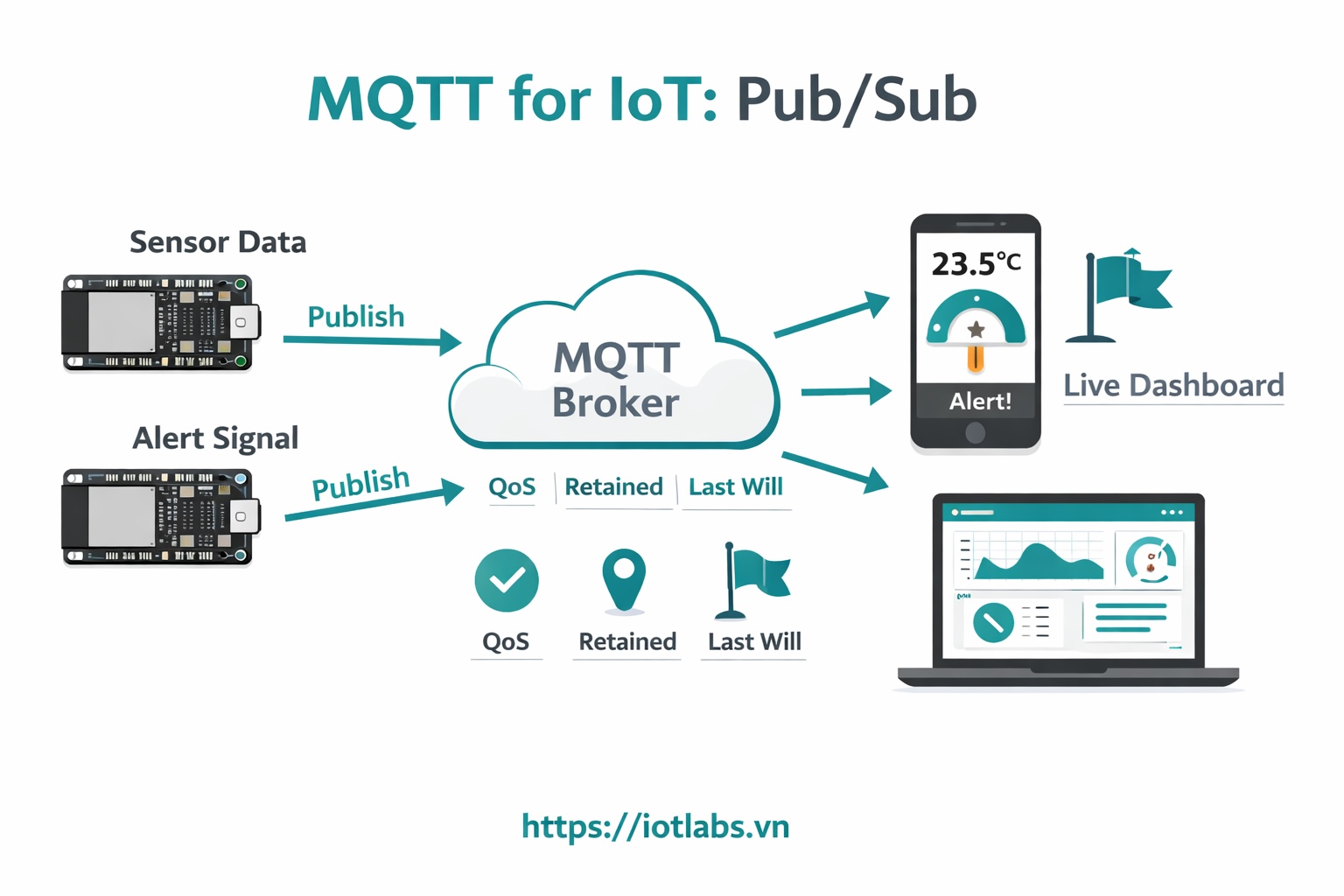 MQTT (Message Queuing Telemetry Transport) là giao thức truyền tin nhắn theo mô hình publish/subscribe, được thiết kế tối ưu cho thiết bị IoT và mạng không ổn định. Trong bài này, bạn sẽ hiểu vì sao MQTT thường phù hợp hơn HTTP khi cần theo dõi từ xa: nhẹ, realtime tự nhiên, dễ mở rộng nhiều thiết bị, và có các tính năng “đúng bài” như QoS (độ tin cậy), Retained (giữ giá trị mới nhất) và Last Will (tự báo offline khi thiết bị rớt mạng).