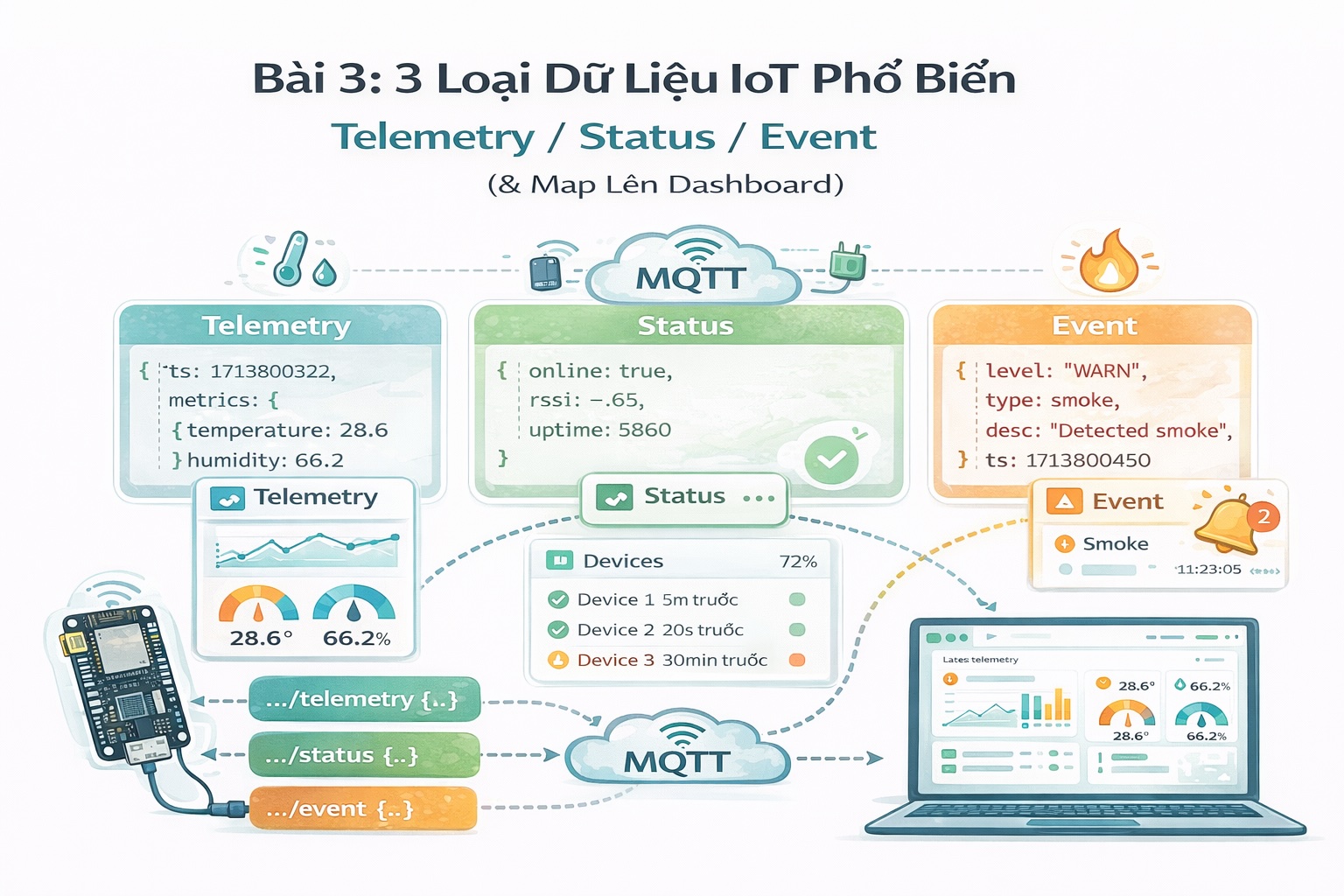Telemetry, Status và Event là 3 loại dữ liệu IoT cốt lõi. Bài viết giải thích dễ hiểu và hướng dẫn sử dụng đúng để theo dõi & cảnh báo hiệu quả.