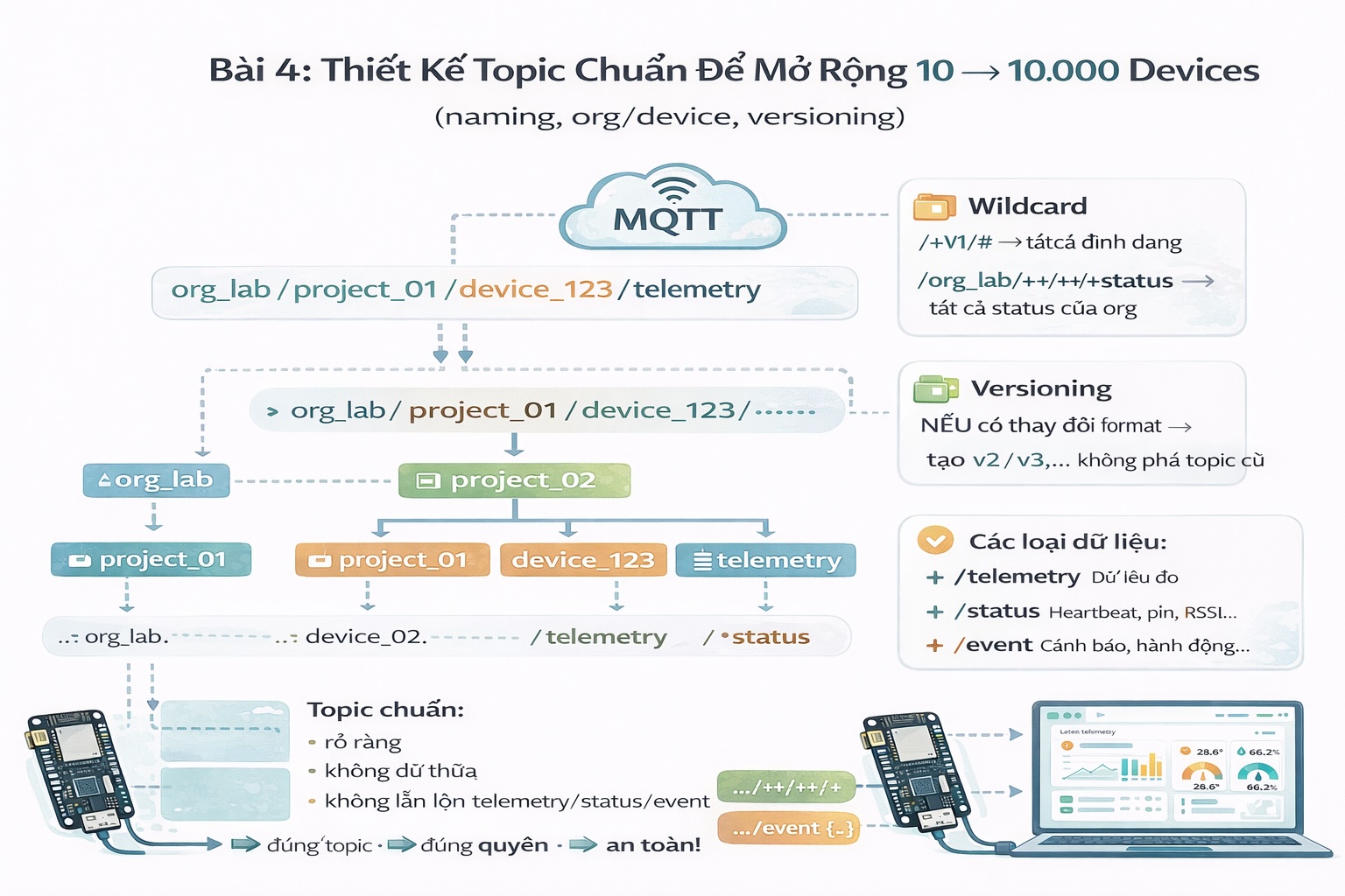 Khi số lượng thiết bị IoT tăng từ vài cái lên hàng trăm, hàng nghìn, topic MQTT trở thành “xương sống” của toàn bộ hệ thống. Trong bài này, bạn sẽ học cách thiết kế topic chuẩn với cấu trúc rõ ràng (org / project / device), tách telemetry–status–event và chuẩn bị sẵn versioning để mở rộng từ 10 lên 10.000 thiết bị mà không cần refactor lại hệ thống.