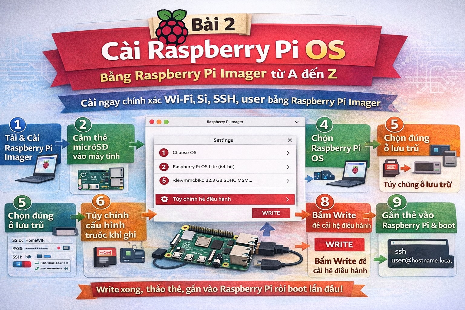 Cài Raspberry Pi OS bằng Raspberry Pi Imager hiện là cách đơn giản và đúng chuẩn nhất để bắt đầu với Raspberry Pi. Bạn không chỉ ghi được hệ điều hành nhanh chóng, mà còn có thể cấu hình sẵn toàn bộ thông tin quan trọng như user, Wi-Fi, hostname và SSH ngay trong quá trình cài.