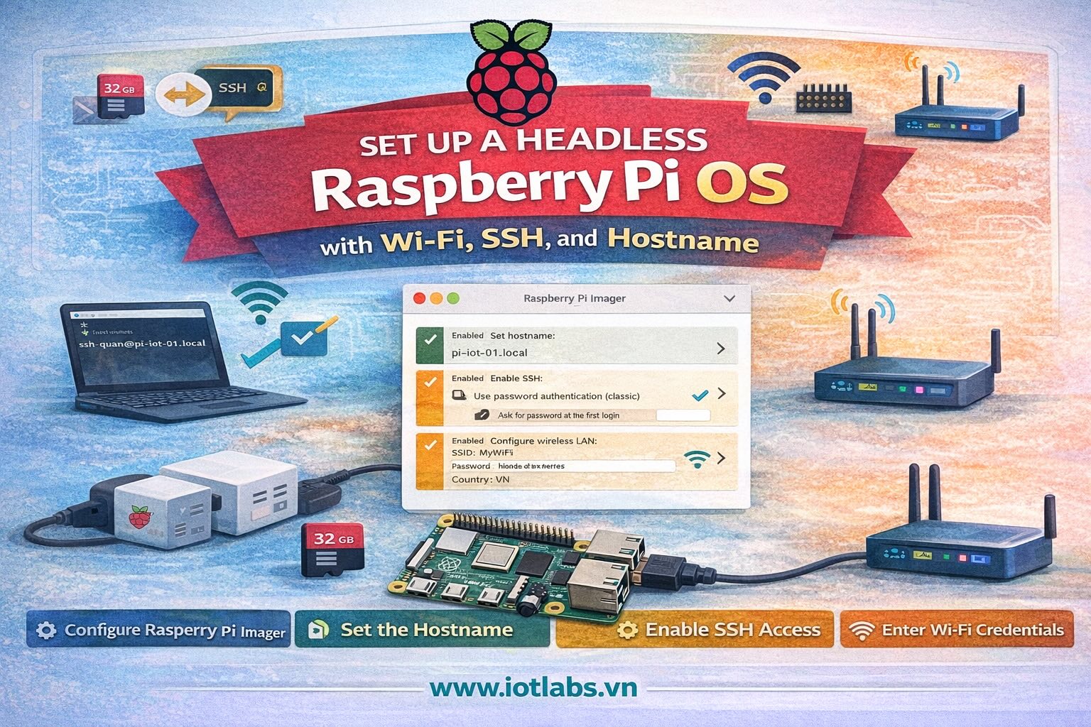 Thiết lập Raspberry Pi headless ngay từ đầu là cách làm rất đáng dùng, nhất là với người học IoT, maker và mini server. Điểm quan trọng nhất là đừng đợi boot xong rồi mới cấu hình, mà hãy chuẩn bị sẵn mọi thứ trong Raspberry Pi Imager: hostname, user, Wi-Fi và SSH. Đó cũng chính là cách mà tài liệu chính thức của Raspberry Pi hỗ trợ cho quy trình setup headless.