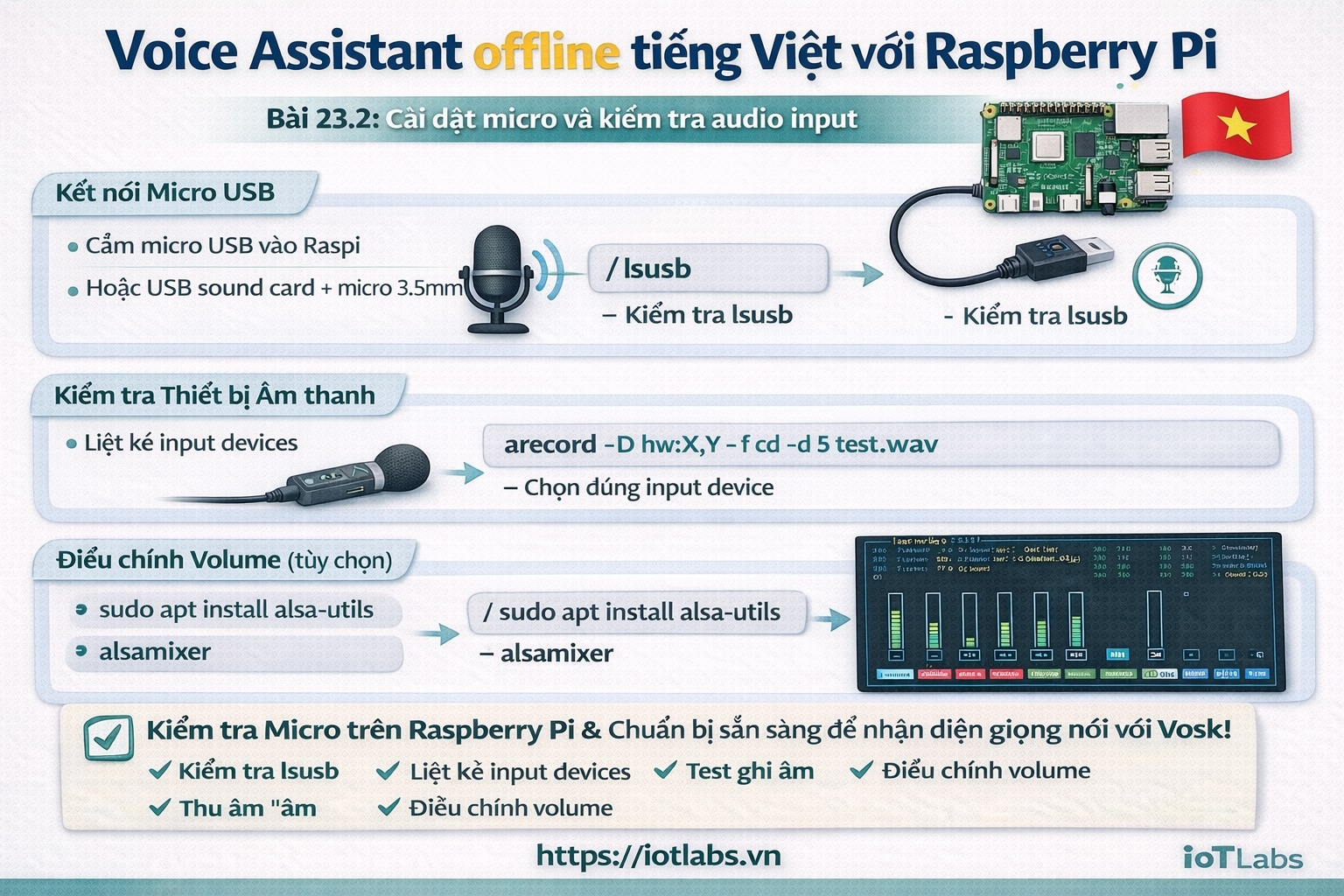 Nếu audio input không ổn định, toàn bộ phần nhận diện giọng nói phía sau (Vosk, command parser…) sẽ hoạt động kém hoặc sai hoàn toàn. Vì vậy, bài này tập trung vào: