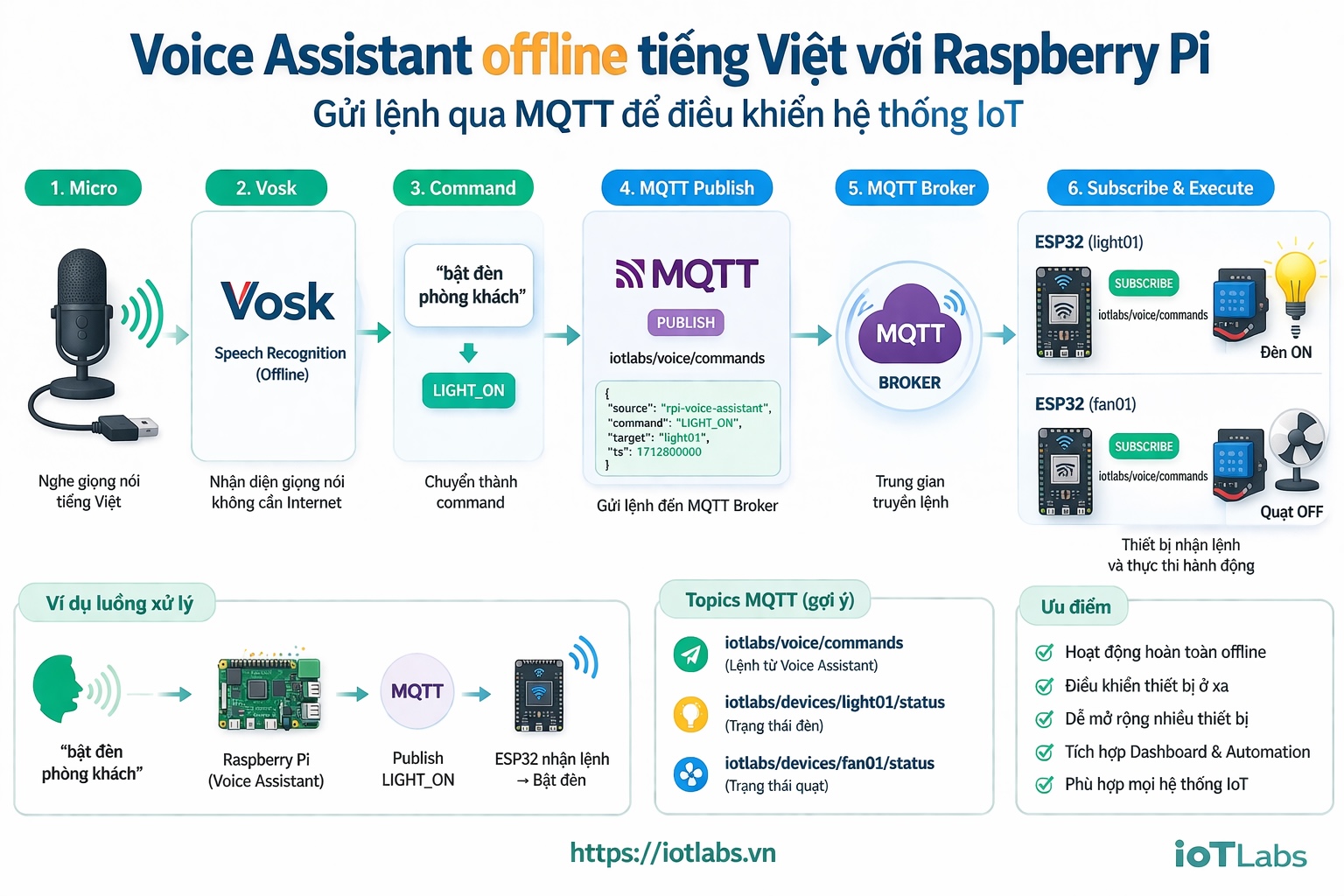Trong bài này, chúng ta sẽ nâng cấp Voice Assistant offline tiếng Việt trên Raspberry Pi từ mô hình điều khiển local sang mô hình gửi lệnh qua MQTT để điều khiển hệ thống IoT.